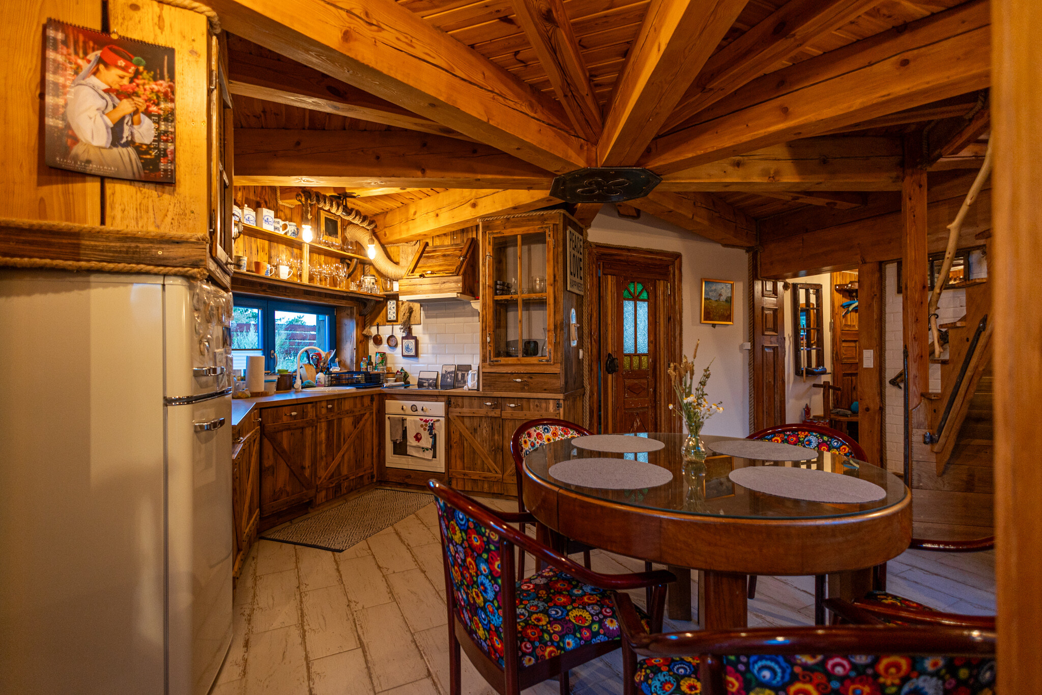 Parter: łazienka z prysznicem i toaletą, salon z okrągłym pięknym drewnianym stołem i 5cioma Krzesłami, w pełni wyposażona kuchnia.