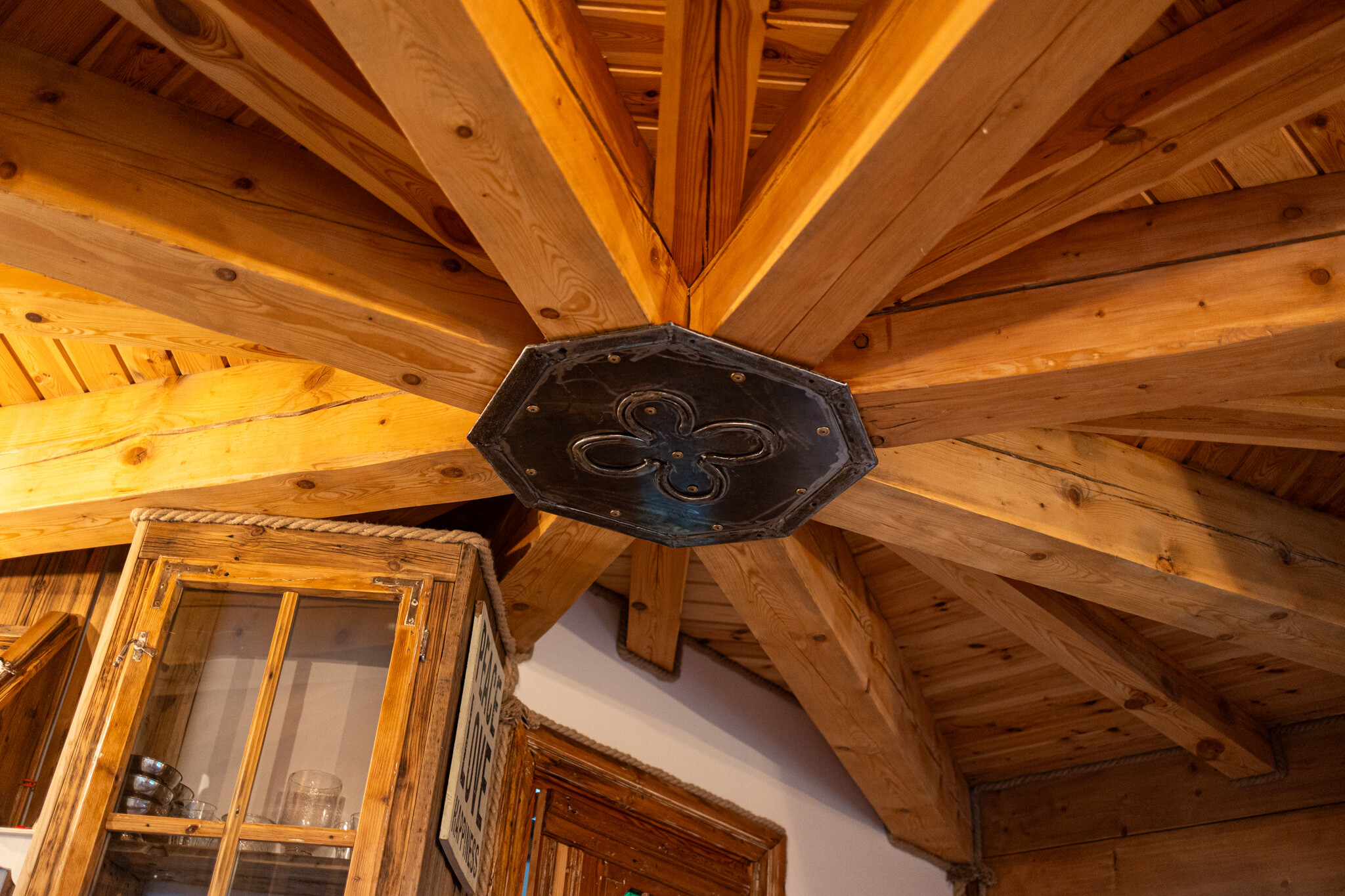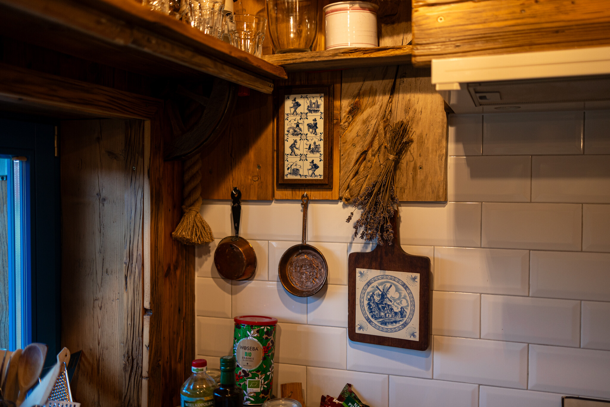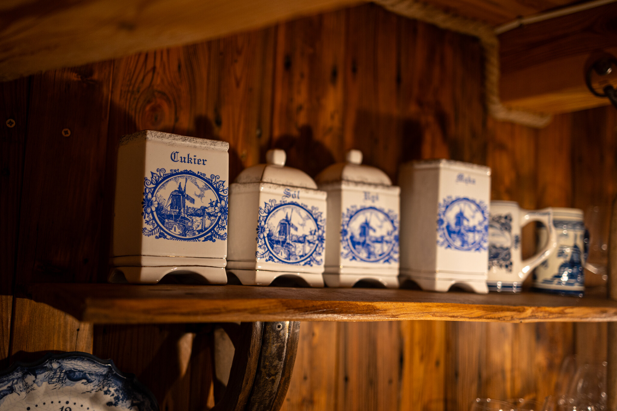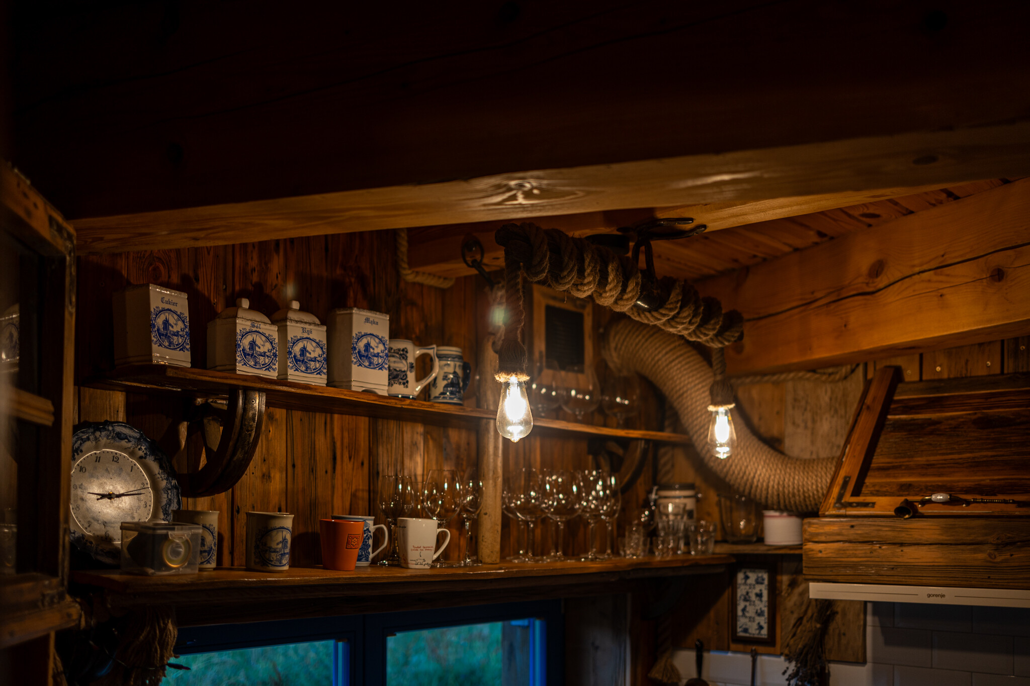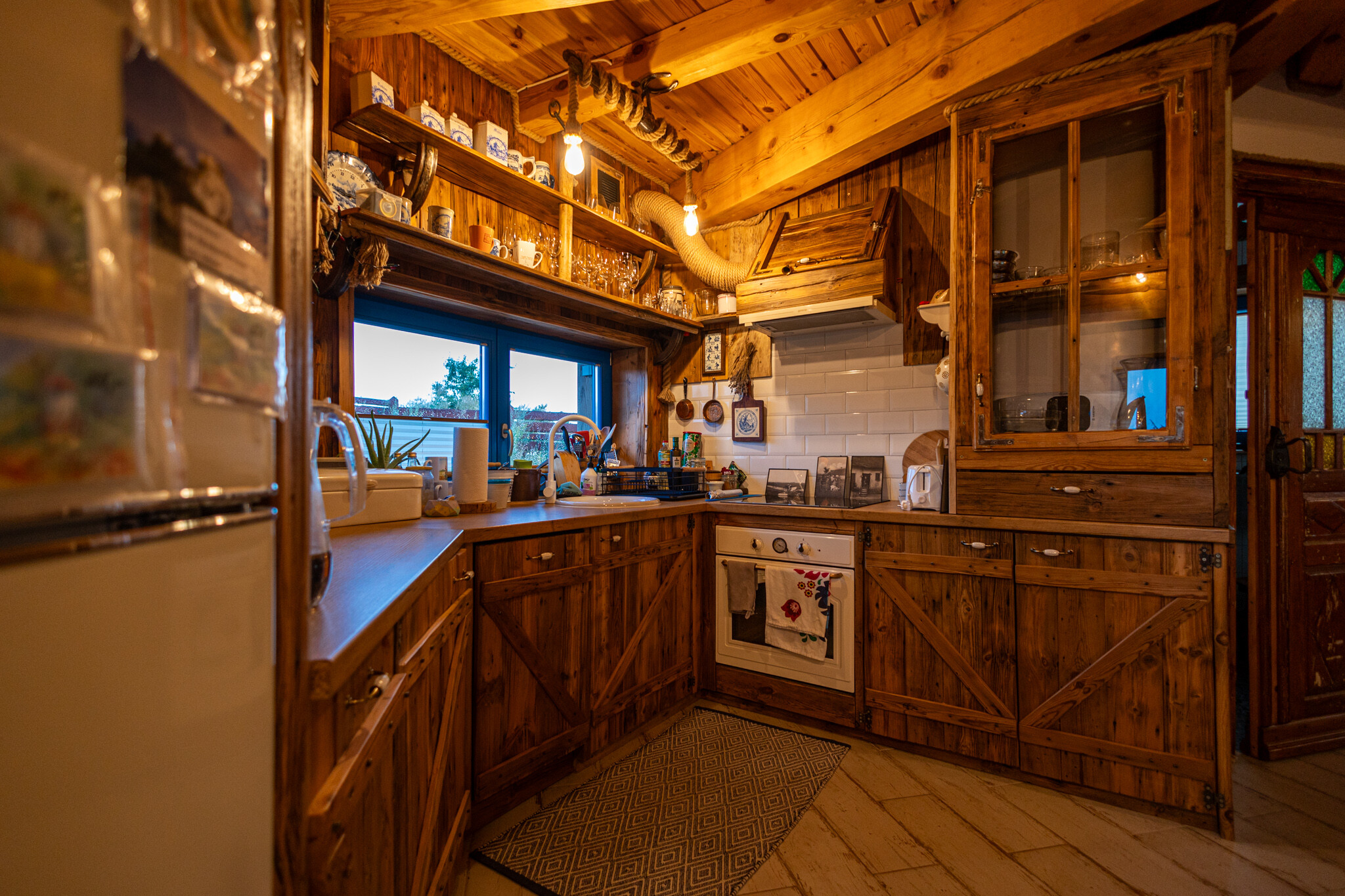 Na najwyższej kondygnacji trzy pojedyncze łóżka, na środkowej jedno podwójne i kącik wypoczynkowy z fotelami, dwa balkony, parter to kuchnia (pralka, zmywarka), jadalnia. Kominek, łazienka z prysznicem.