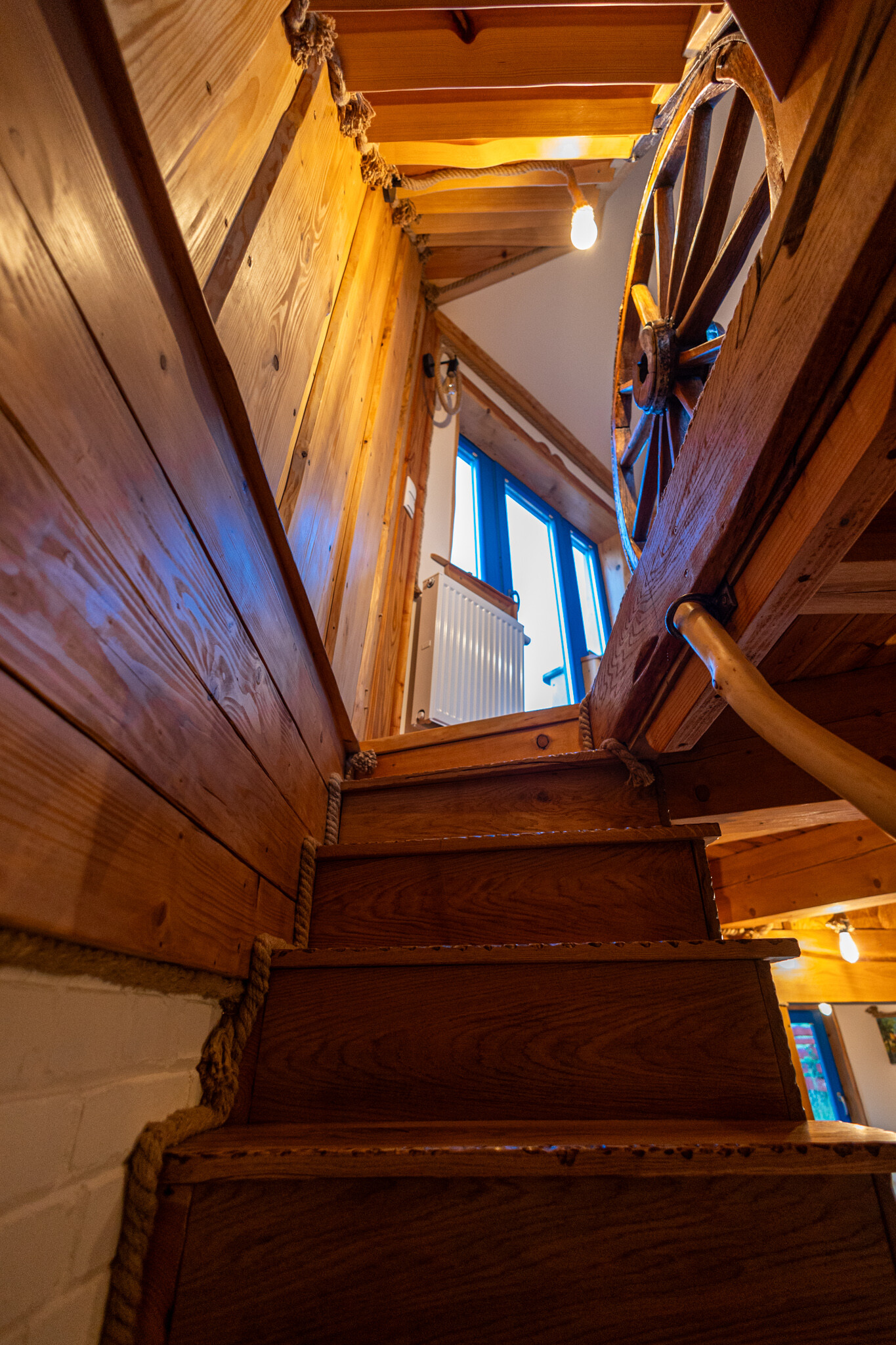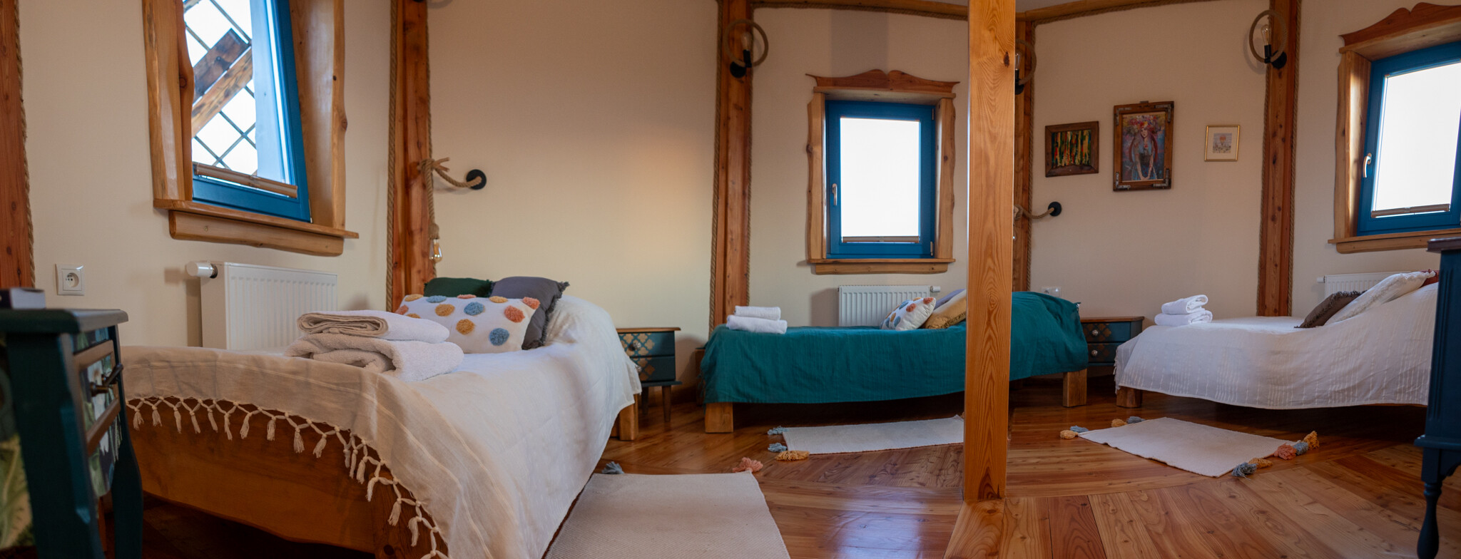 Piętro 2gie : 3 pojedyncze łóżka, szafki nocne, widok dookoła wiatraka przez 3 niebieskie okienka.