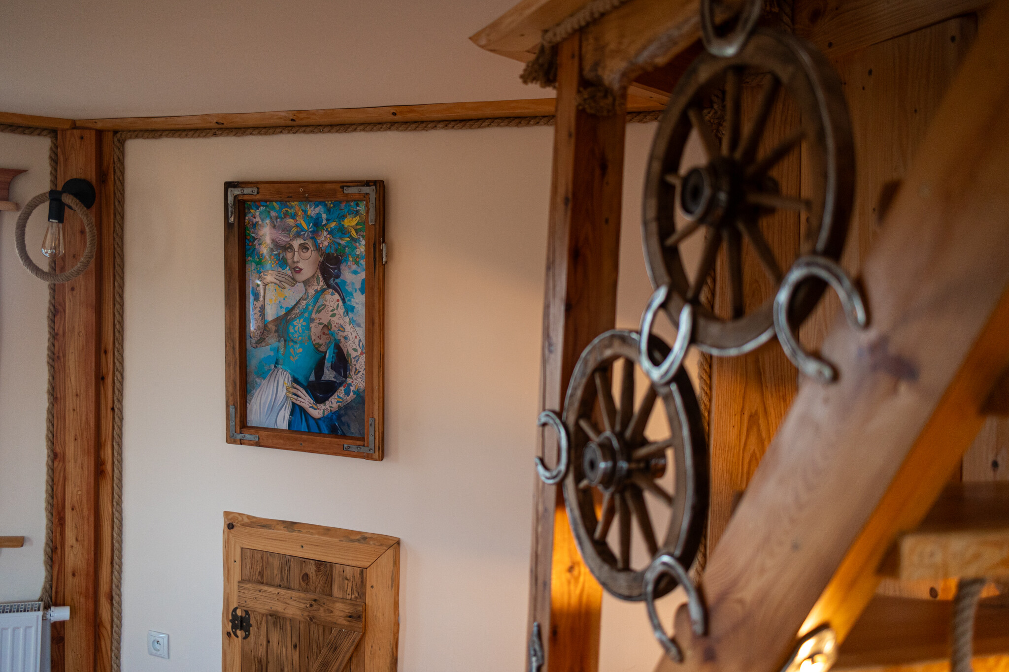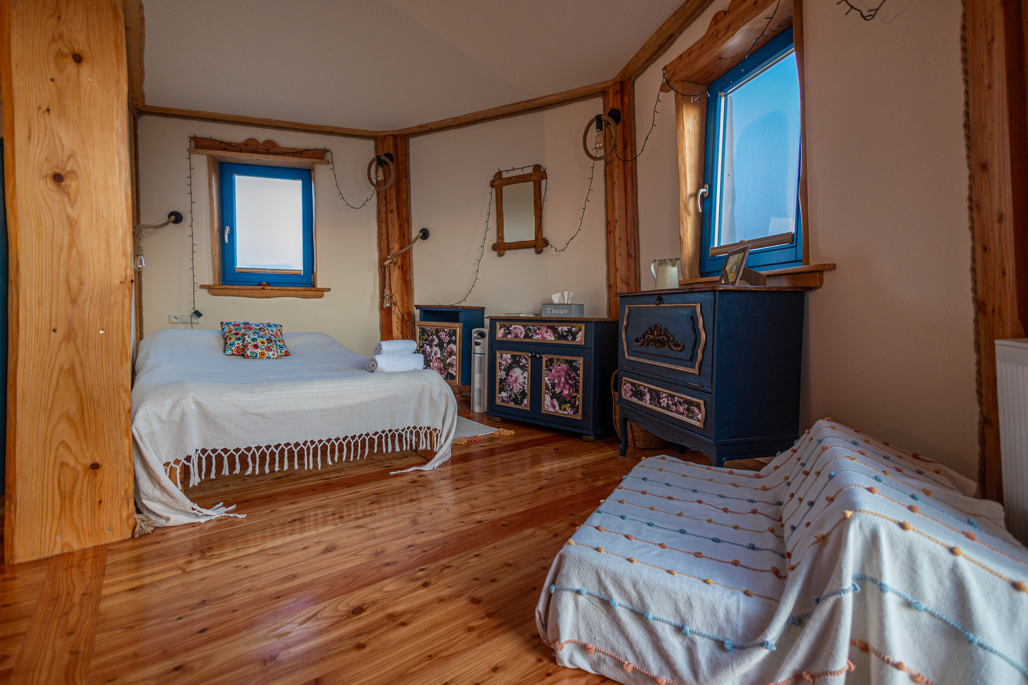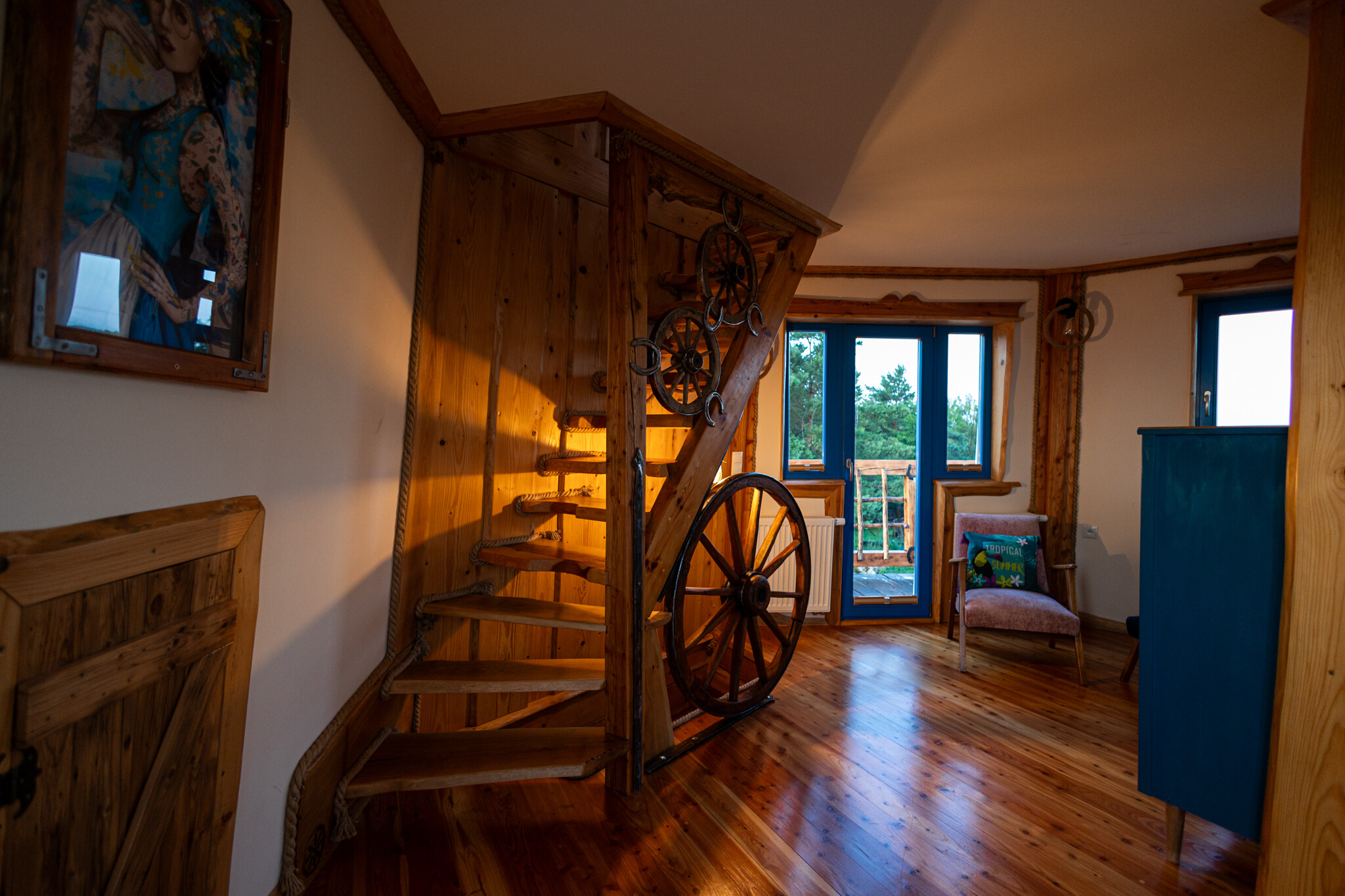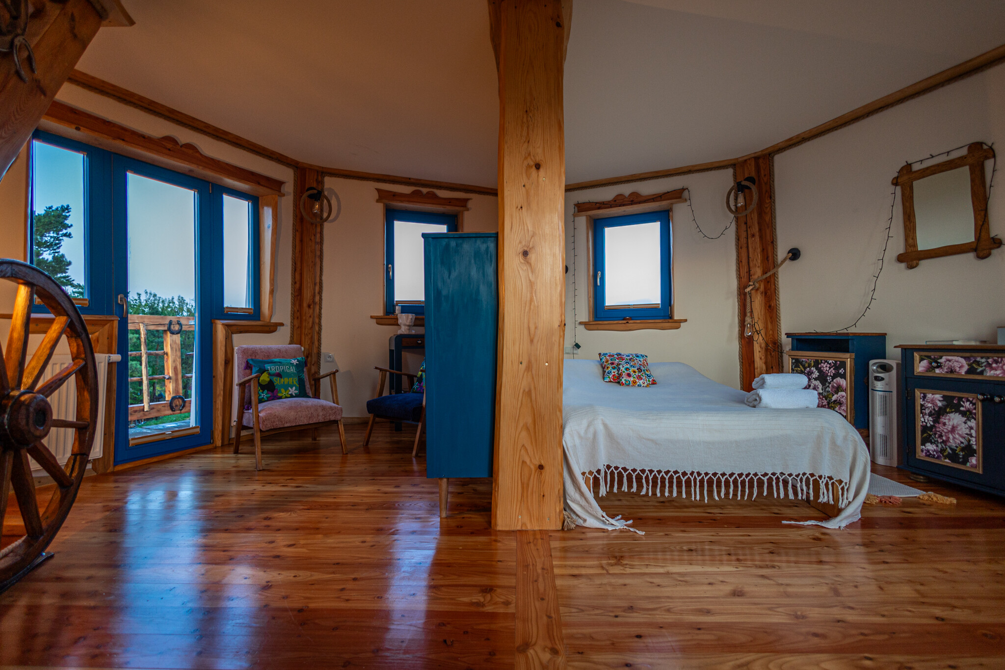 Piętro 1wsze: Sypialenka romantyczna dwuosobowa z łóżkiem podwójnym, kącik wypoczynkowo czytelniczy z dwoma fotelami. Z tego piętra jest wyjście na dwa balkoniki, jeden dookoła wiatraki, a drugi taki malutki z widokiem na Siedlisko.